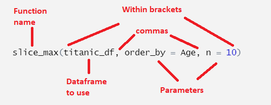 Here, we use the function slice_max on the dataframe titanic_df (we’ll learn what this does later). This time we have to set two parameters. Parameters have specific names and we set their values using an single equal sign. Here, we have to set the order_by parameter, which we have set to the column Age, and we have to set the n parameter, which we set to 10.