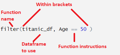 Different functions will need different instructions, depending on what they do. The code above runs the filter() function on the dataset titanic_df, with the instruction that the data in the Age column should equal 50.