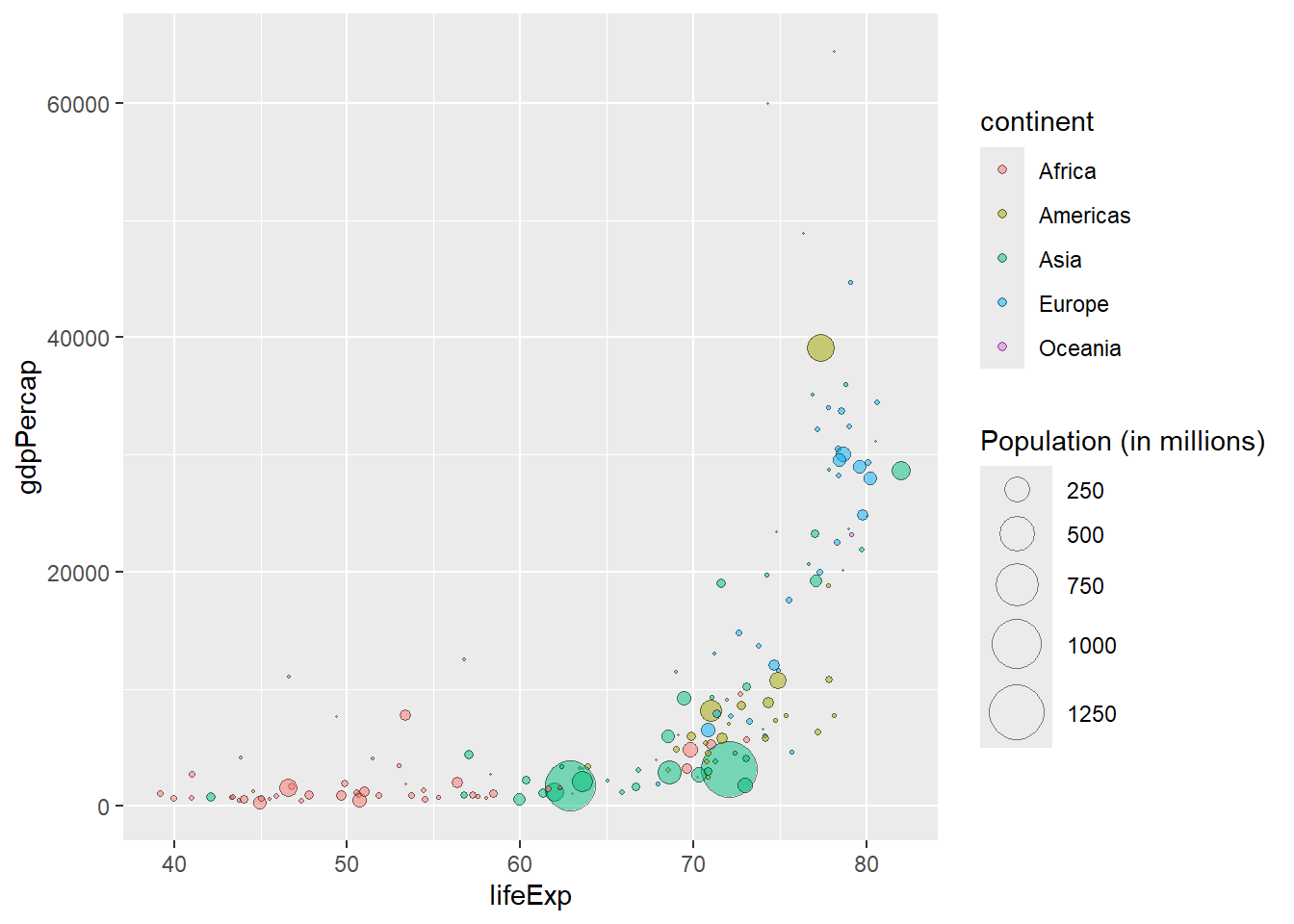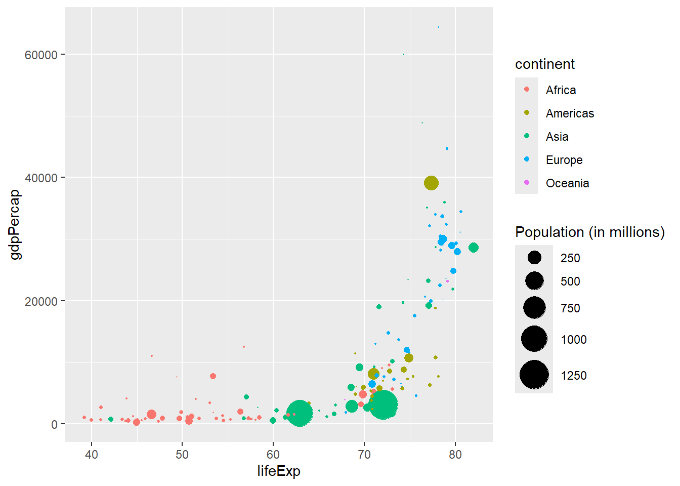 ggplot(aes(x = lifeExp, y = gdpPercap, size = pop, color = continent)) +
