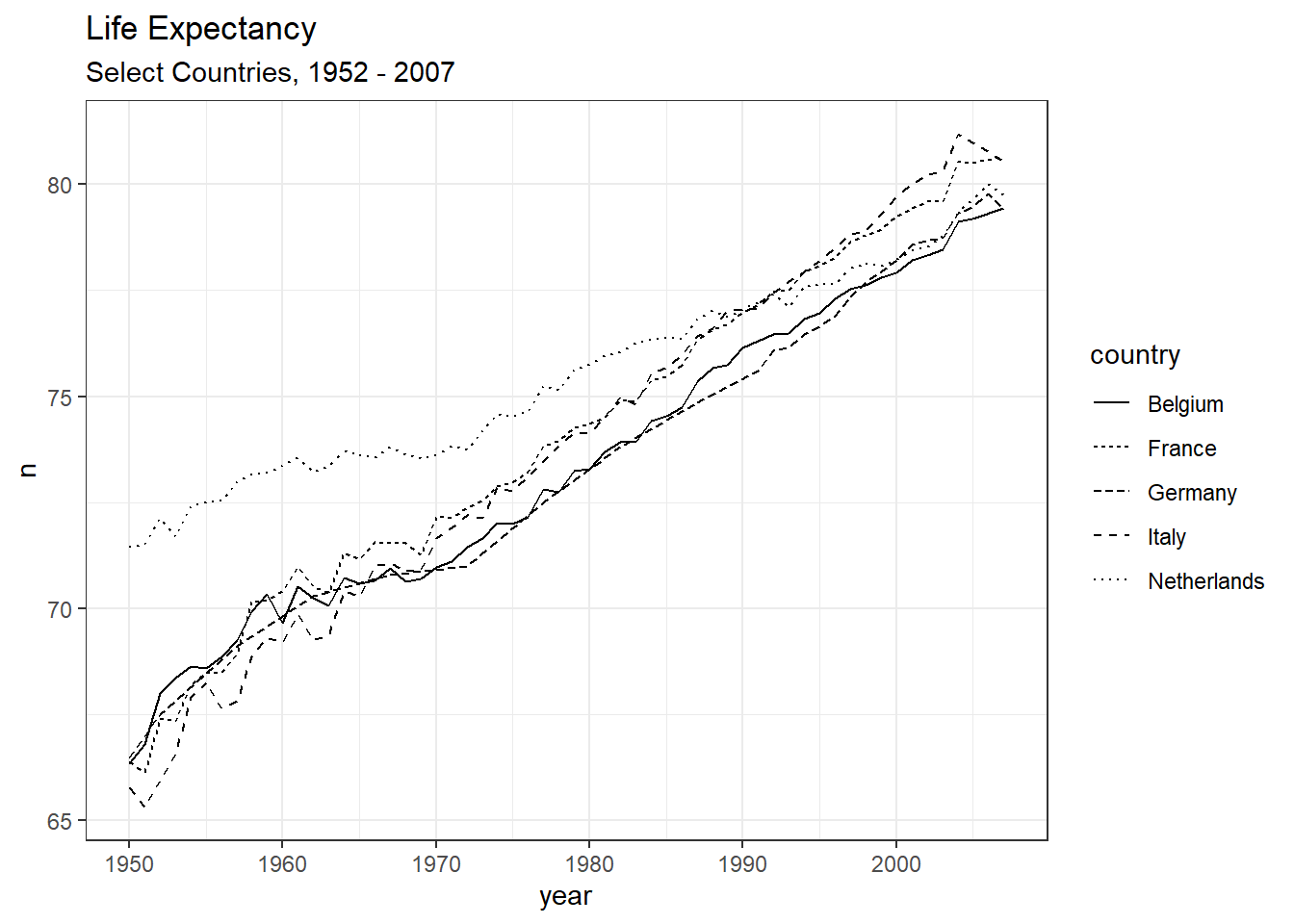 labs(title = "Life Expectancy", subtitle = "Select Countries, 1952 - 2007") +