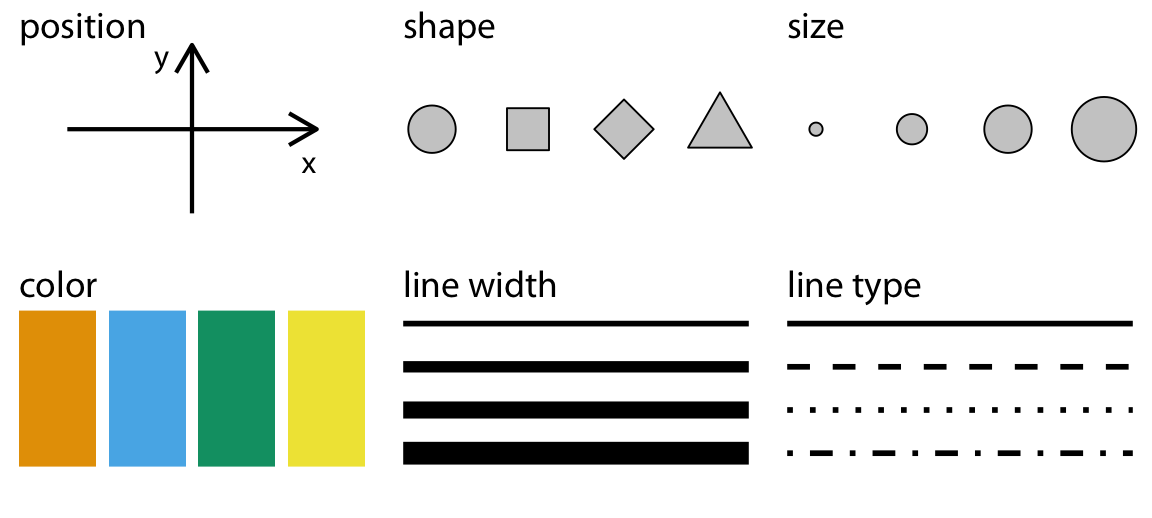 There are many possible aesthetics, but some of the most commonly-found in infovis are: