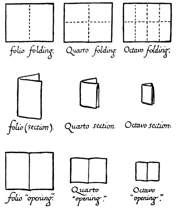 The largest size (a single fold) was called folio, followed by quarto, octavo, and duodecimo. (you might have heard of the Shakespeare ‘first folio’, which is so named because it was the first time Shakespeare was published in folio format - individual plays had previously been published as quarto).
