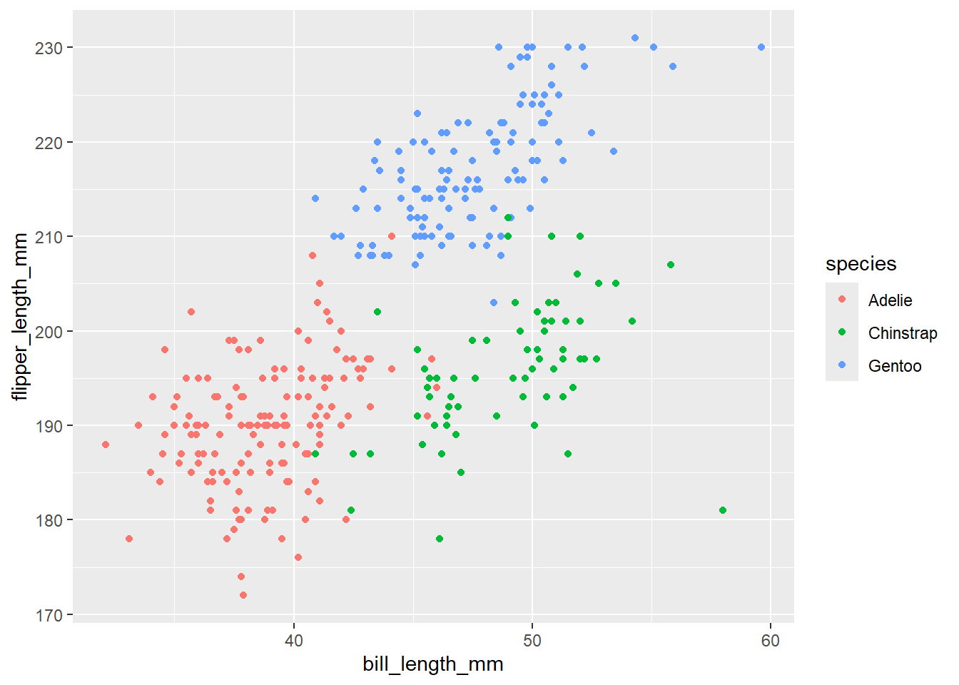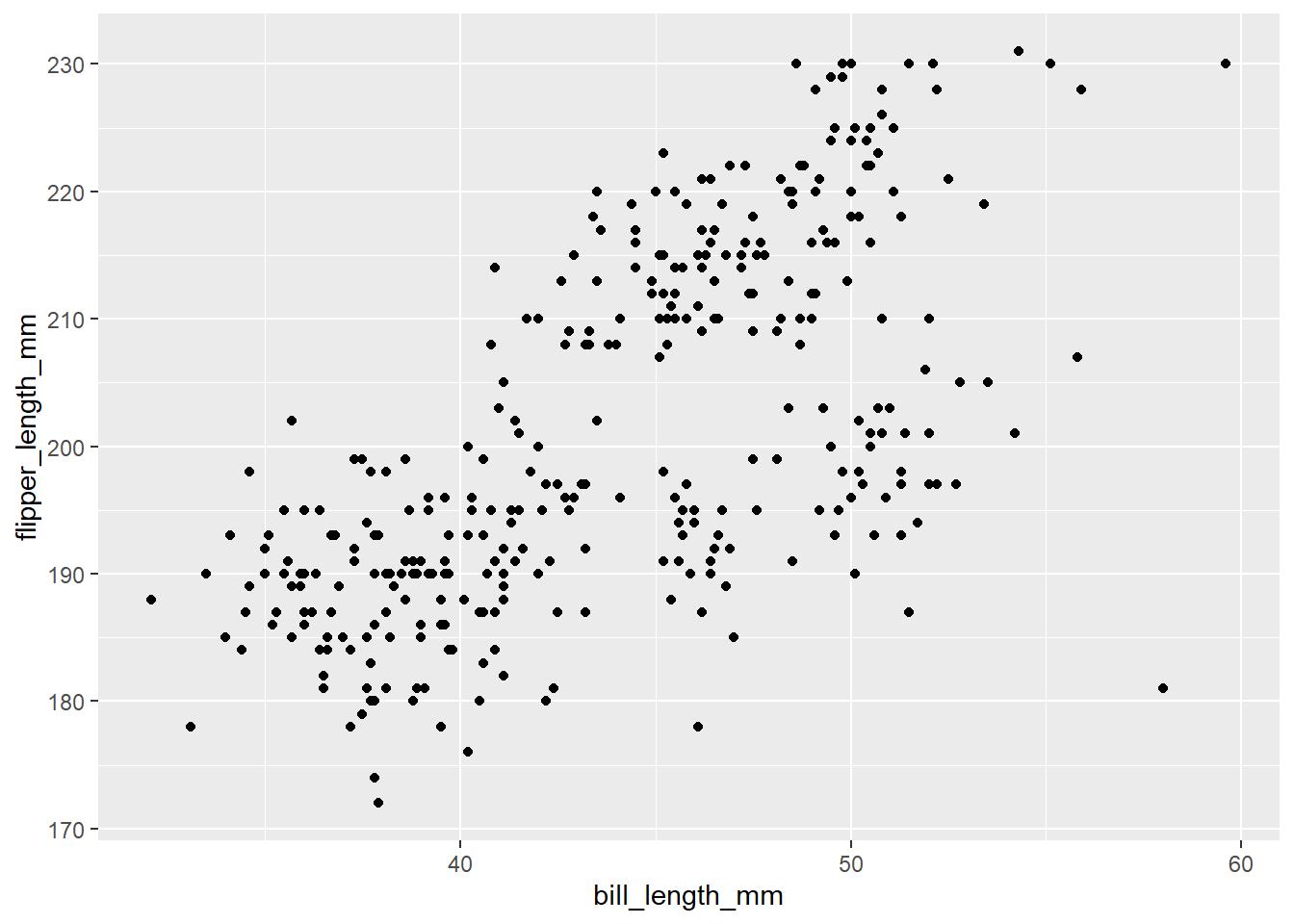 Take this scatterplot, which visualises the relationship between bill length and flipper size in a dataset of penguin observations.