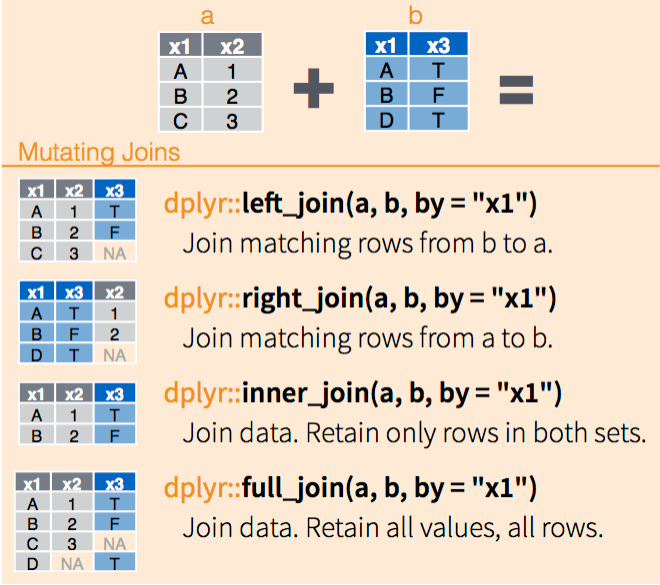 Another set of commands we’ll use quite often in this course are the join() ‘family’. Joins are a very powerful but simple way of selecting certain subsets of data, and adding information from multiple tables together.