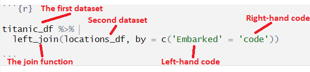 Joins need a common key, a column which allows the join to match the data tables up. It’s important that these are unique (a person’s name makes a bad key by itself, for example, because it’s likely more than one person will share the same name). Usually, we use codes as the join keys. If the columns containing the join keys have different names (as ours do), specify them using the syntax below: