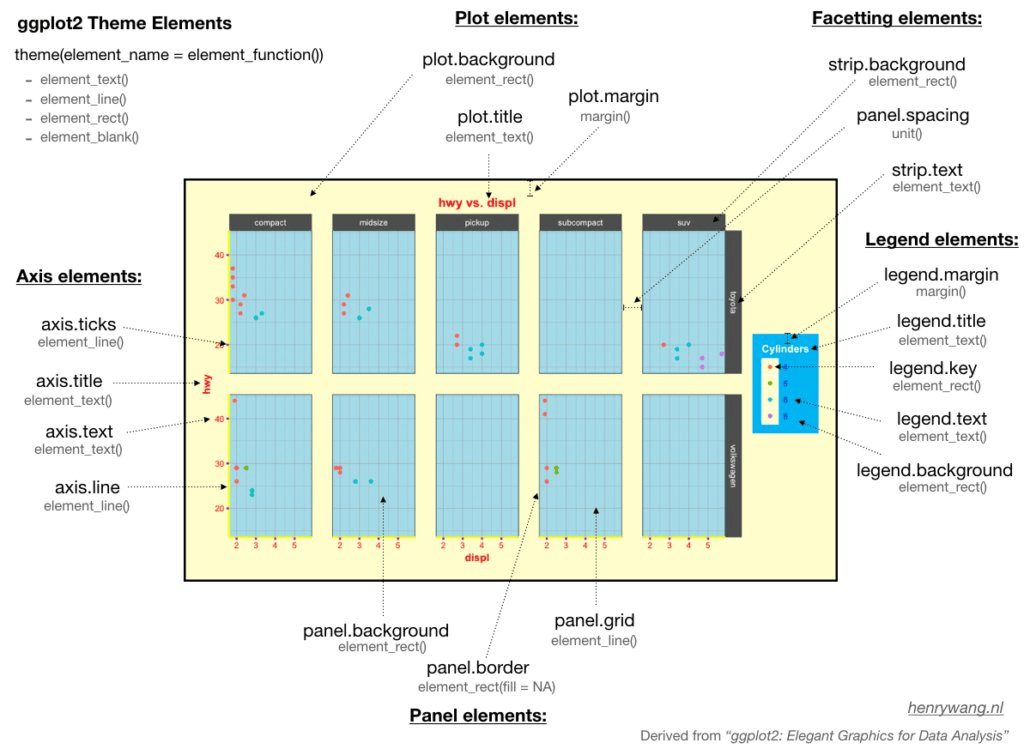Each visual part of a chart is known as an element, and we can make changes to each part separately. This is done by adding + theme() layer to your chart, followed by the element you want to change, then an element type, and finally, the aesthetics of that element you want to change. The full list of elements and types can be found in the figure below - it’s very useful to save a copy as a reference.